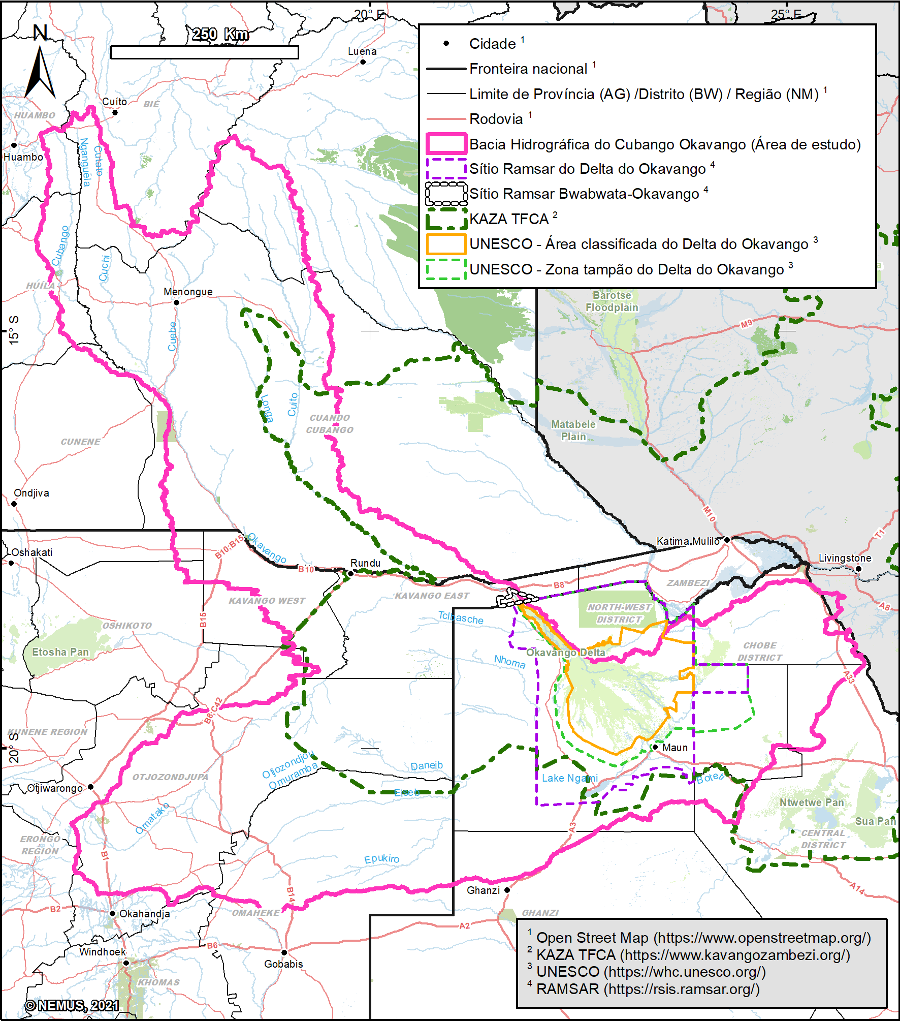 A área de estudo da AAE corresponde à bacia hidrográfica do rio Cubango‑Okavango, de acordo com as delimitações usadas na TDA da BHRCO (OKACOM C. P., 2011a).